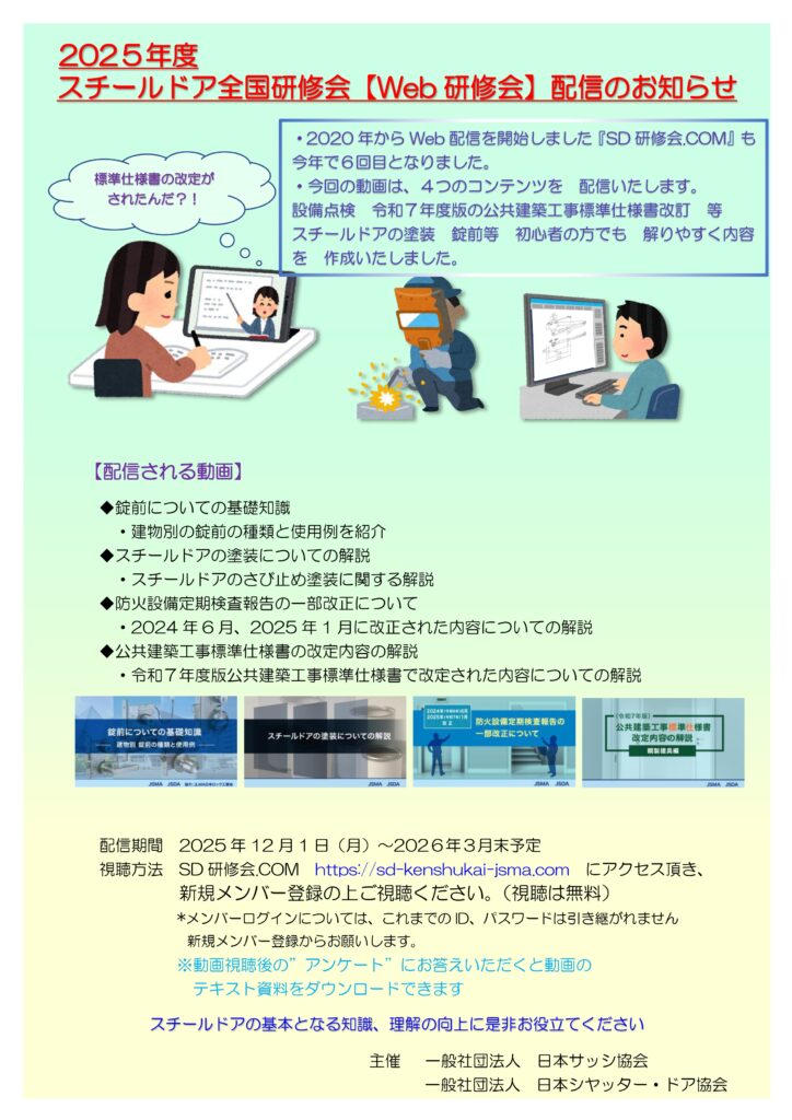 さて、(一社)日本サッシ協会及び(一社)日本シヤッター・ドア協会(以下「両協会」)で準備を進めておりました、2025年度スチールドア全国研修会「Web研修会」の準備が整いましたので、以下にご案内申し上げます。